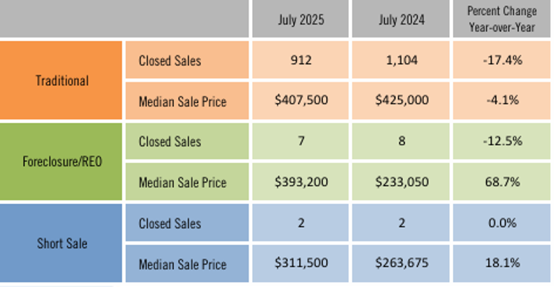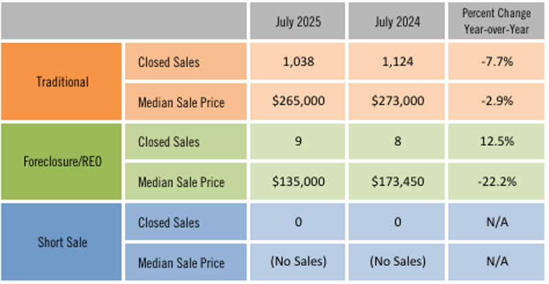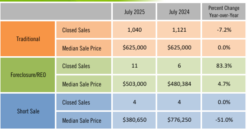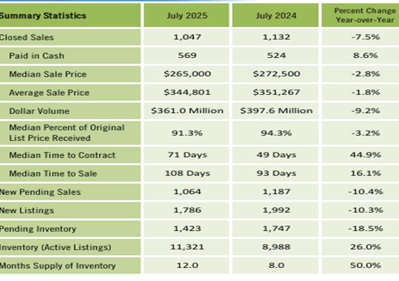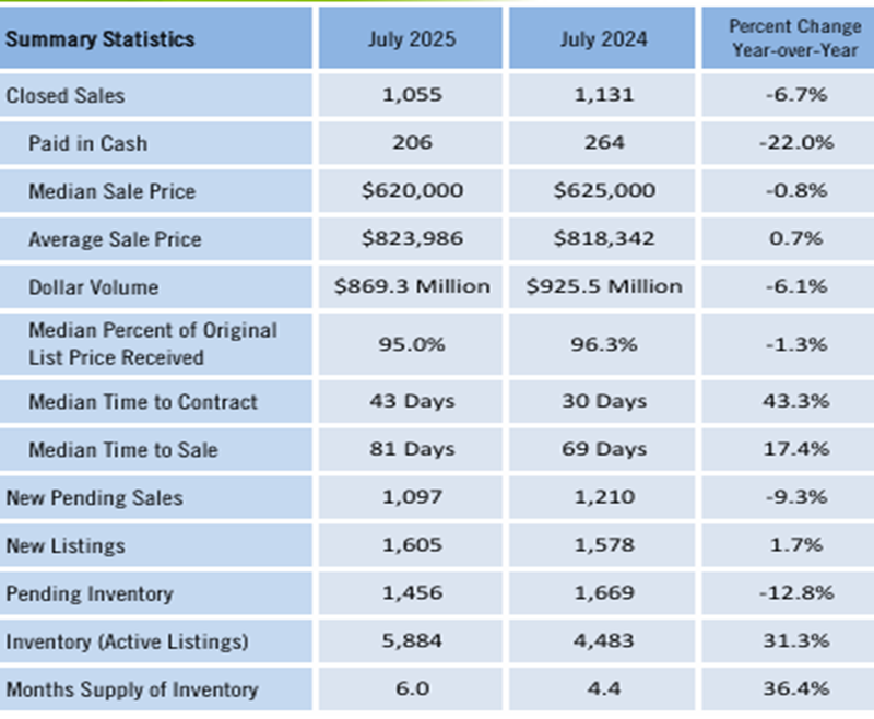 Closed sales in July 2025 compared to July 2024, along with median prices, saw a slight decrease of 1.5%. In contrast, the average sales price increased by 6.1%.