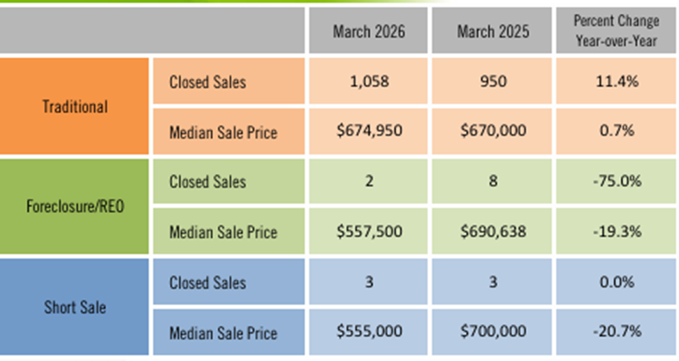 The real estate market in March 2026 demonstrates solid growth; closed sales increased by 10.6%, reflecting heightened activity, while the total transaction volume rose by 22.6%. Prices remain stable, showing a slight upward trend. The average price climbed 10.9%, and the median price grew 0.6%, steering the market toward an adjustment. However, the market is moving at a slower pace, with the time required to go under contract increasing by 28%, and the total time to close a sale rising by 13.2%. This resulted in a 17.8% decrease in the number of properties entering the market, while active inventory fell by 7.4%.